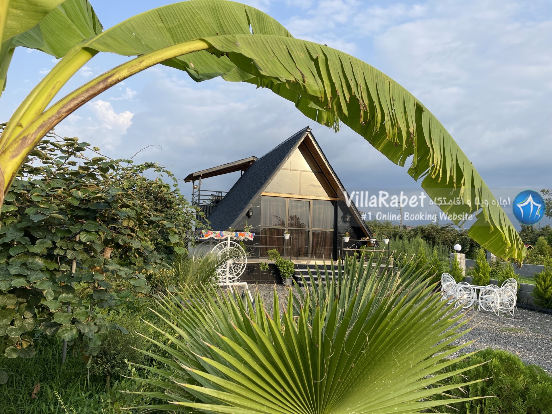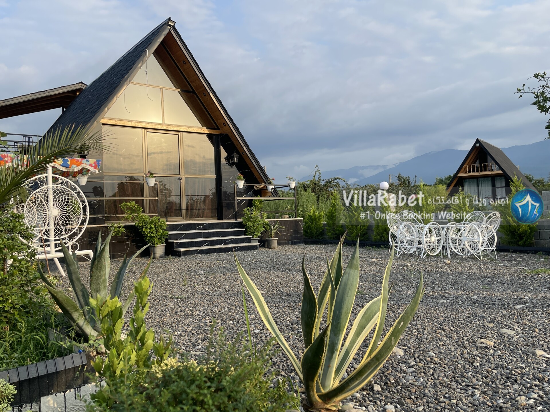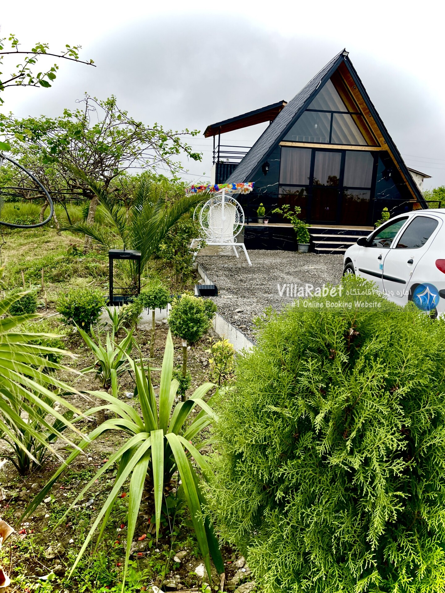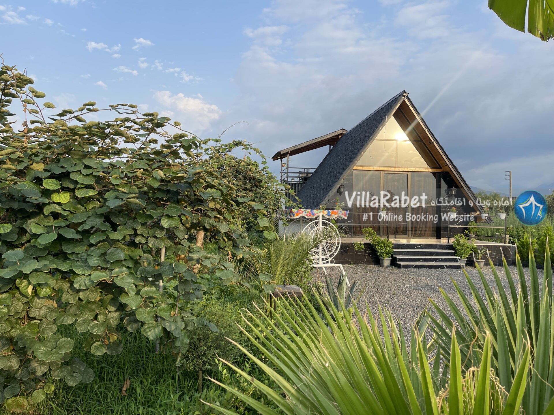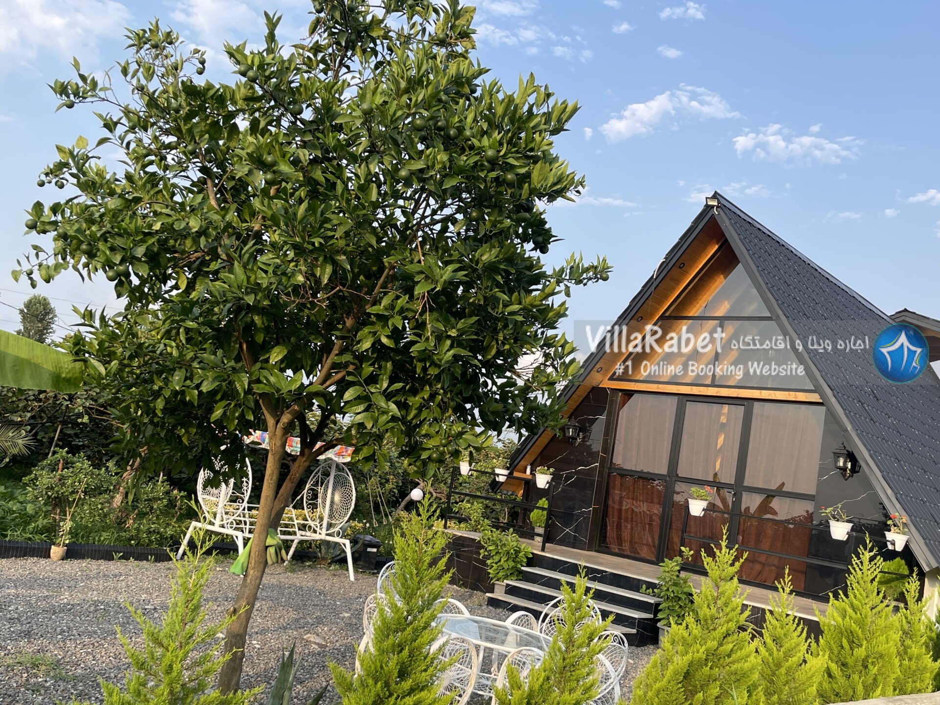 کلبه چوبی سویسی ویو کوه وجنگل به متراژ صد متر تک خواب همراه تراس ویو کوه و جنگل و دور تا دور باغ مرکبات و کیوی