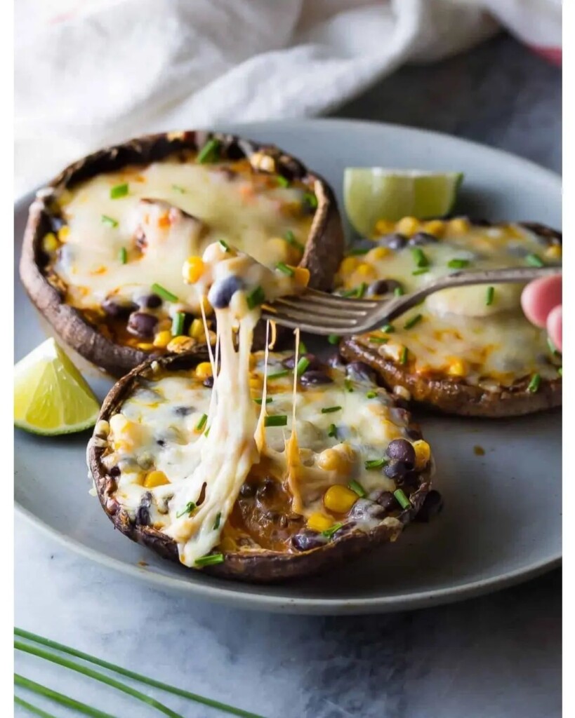 برای تهیه پورتوبلو، ابتدا باید به آرامی درپوش قارچ و سطح زیری اونو بشورید( به قارچ هایی با کلاه های گرد و بدون ترک نیاز دارید ). بعد، با استفاده از یک قاشق،خیلی اهسته توی کلاهک قارچ خالی کنید و دوباره آبکشی کنید. بزارید کمی خشک بشن. روی کلاهک های قارچ رو به روغن زیتون آغشته کنید و توی یه بشقاب بزرگ بچینید. توی یه کاسه متوسط، سس انچیلادا، نمک و آرد را با همزن بزنید تا گلوله ای باقی نمونه.ذرت و لوبیا سیاه و پیازچه رو مخلوط میکنیم ،و توی هر قارچ حدود ۲ ق غ بریزید روی اونا رو با پنیر پر کنید.